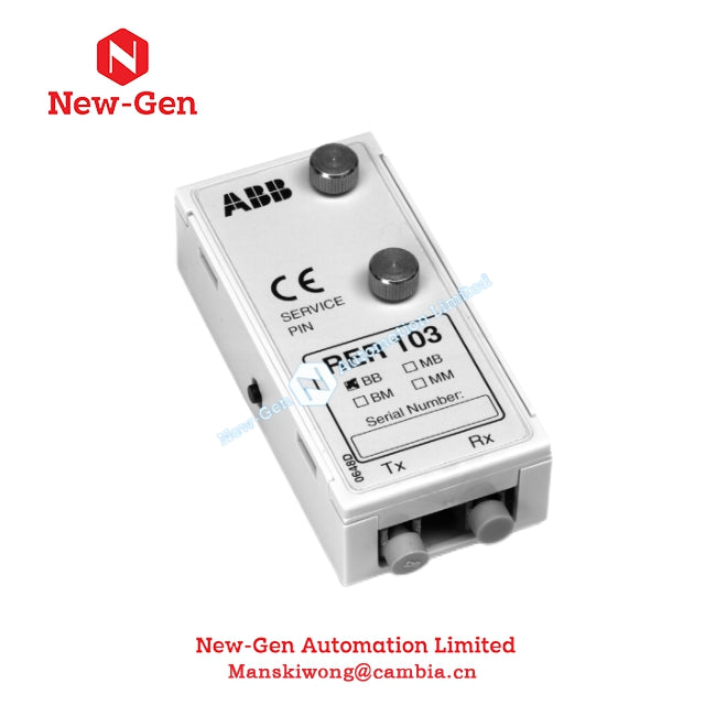The ABB RER103 is a bus connection module that converts optical signals from SPA, LON®, and IEC 60870-5-103 fiber-optic buses into electrical RS-485 signals. It enables reliable communication between RE_500 series devices and external networks, offering high immunity to electromagnetic interference.
